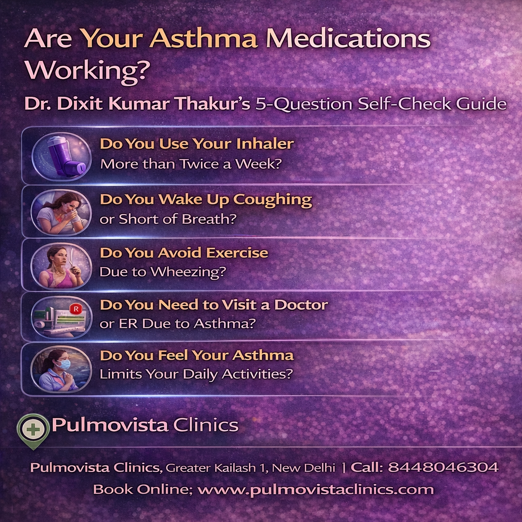 | “Use this 5-question checklist before your next consultation at Pulmovista Clinics — because the answer to every question tells me something about whether your asthma medications are actually working. Most patients arrive at my clinic believing their medications are fine. The checklist tells a different story.” — Dr. Dixit Kumar Thakur, Senior Pulmonologist, Pulmovista Clinics, Delhi |
