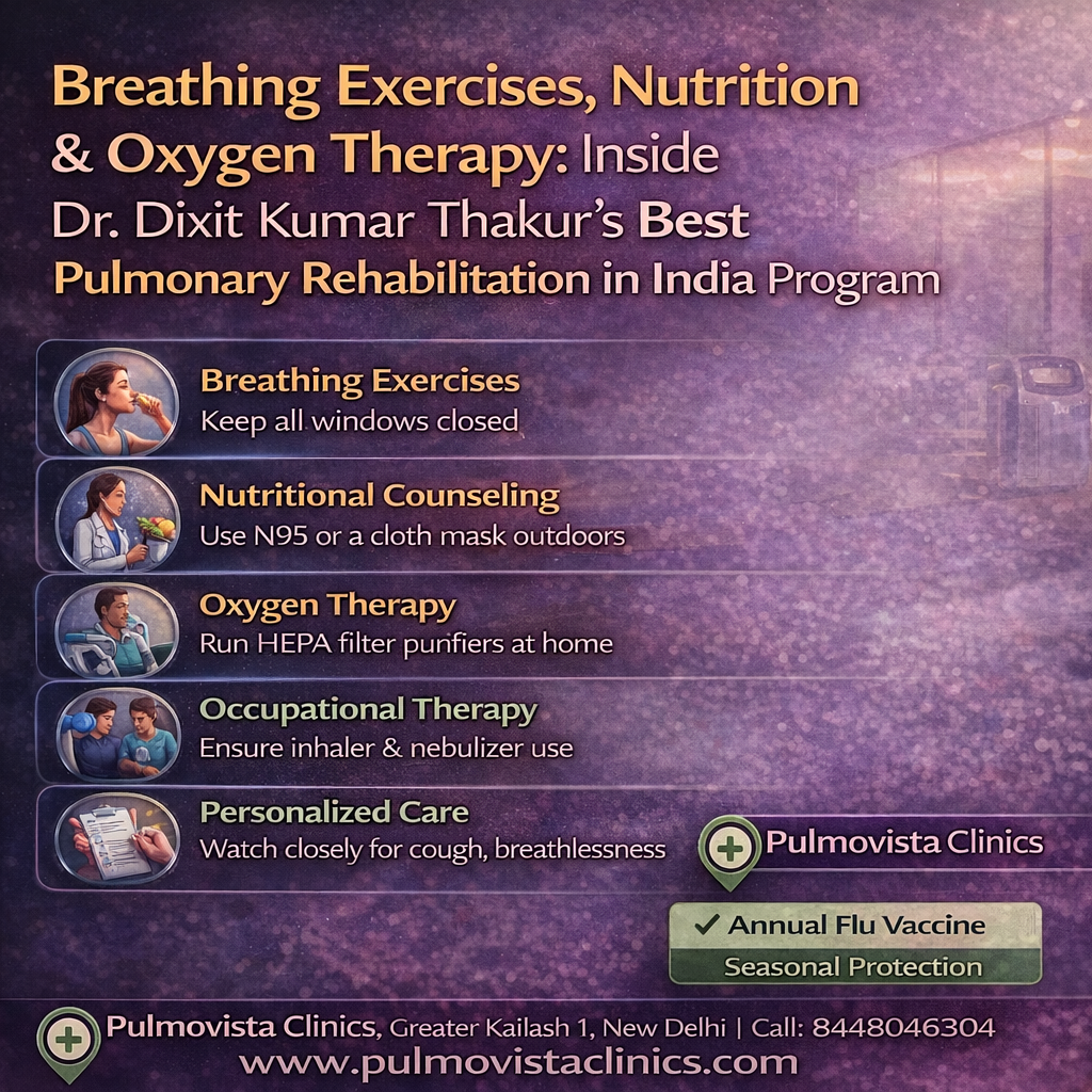 • Physiotherapy for COPD — as provided by most general physiotherapy clinics — typically focuses on airway clearance and basic breathing exercises. The Pulmovista pulmonary rehabilitation programme is comprehensively different: it includes medically supervised progressive exercise training at individually prescribed intensity; inspiratory muscle training; multi-domain nutritional assessment and support; formal psychological screening and integrated psychological support; structured multi-topic patient and caregiver education; and a long-term follow-up plan — all under the direct oversight of me, Dr. Dixit Kumar Thakur, as senior pulmonologist. The evidence base for this comprehensive approach far exceeds that for physiotherapy alone.